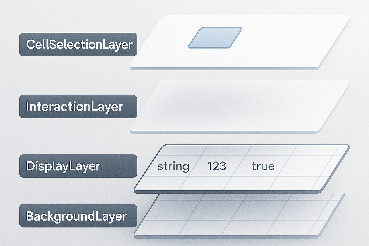 문제는 입력이었습니다. 기존에는 셀마다 독립된 input 요소가 있었지만, Canvas에서는 이런 구조가 불가능합니다. 이를 해결하기 위해 화면 전체에 단 하나의 input 요소만 두고, 클릭한 셀 위에 해당 input을 위치시키는 방식을 사용했습니다. 이 구조를 위해 Canvas 레이어를 4단계로 나눴습니다.