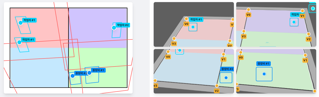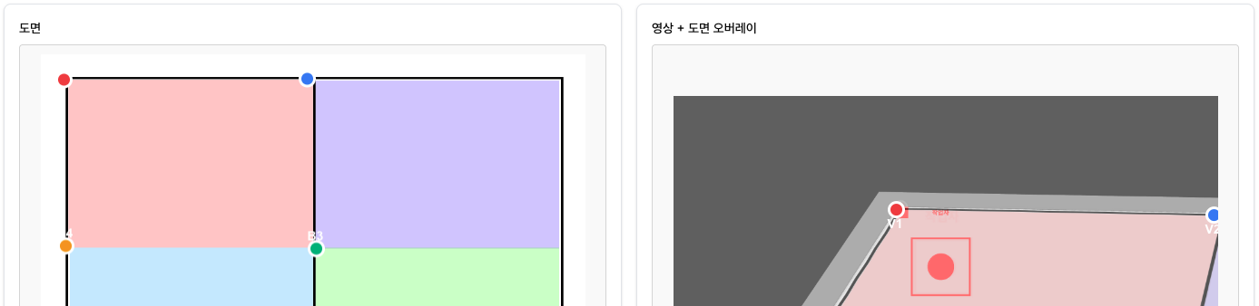 이제 카메라와 현실 세계, 도면 간의 관계를 마련했으니 이걸 활용하기만 하면 된다. Vision AI를 통해 CCTV 영상을 분석하고 영상에서 추적한 객체의 좌표를 H를 역변환하여 도면 위에 표시하는 것을 구현했다. 반대로 도면에 찍은 마커를 CCTV 영상에 투영하는 것 또한 가능하다. Vision AI 쪽은 내가 담당하진 않았지만 대충 영상을 프레임 단위로 캡처하여 Yolo 모델을 통해 객체를 인식하고 좌표를 추출하는 것 같다. 고수준의 AI 기술을 목표로 하는 것이 아니라면 객체 인식 모델은 널리고 널렸고 보편화되어 있기 때문에 취사 선택하면 된다.